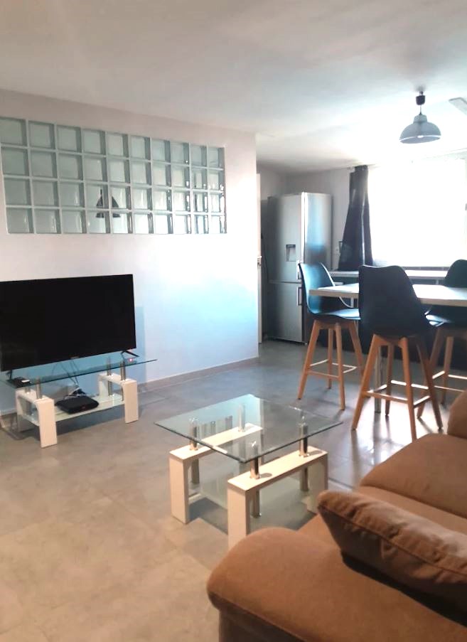 - Salon avec cuisine ouverte équipée (plaques de cuisson, four, micro-ondes, bouilloire, cafetière Nespresso, cuiseur à riz, vaisselle et ustensiles)